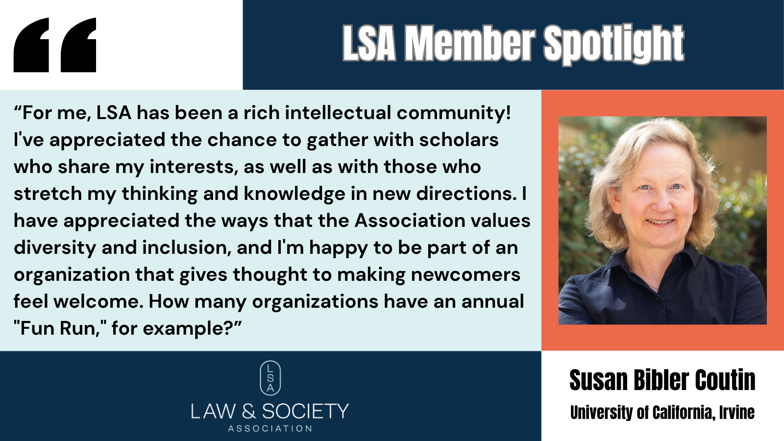 Learn more about Susan Bibler Coutin, her many publications, media appearances, awards, and involvement with academic organizations here.